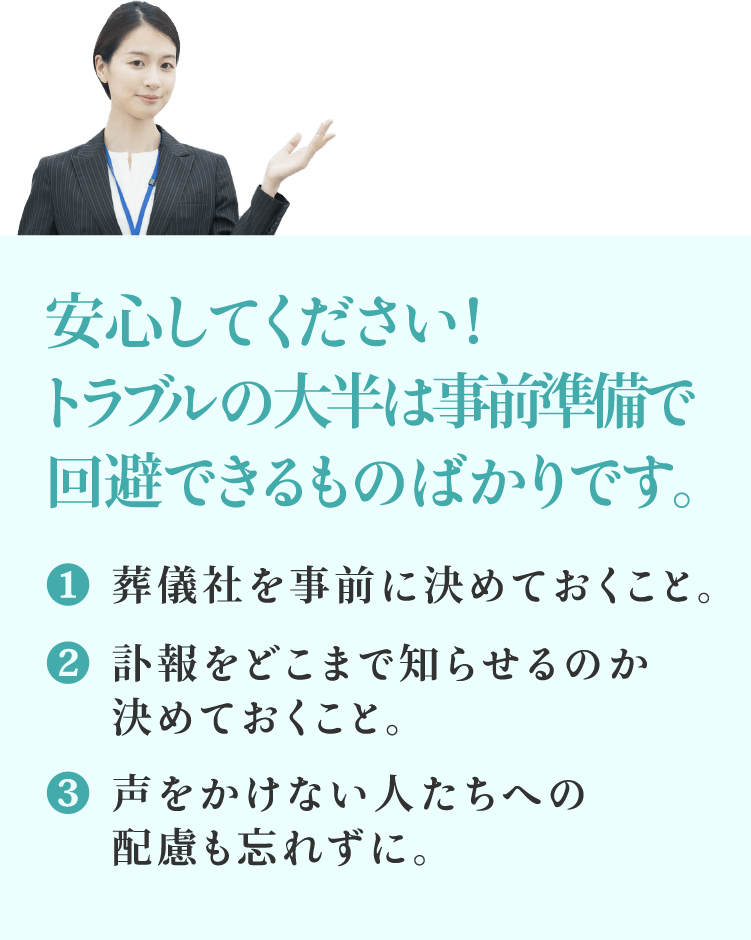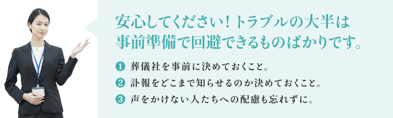 自社でスタッフを持たず、下請け業者に葬儀を依頼する会社には、いざ“その時”を「どこの葬儀社が対応するのかわからない」という不安があります。